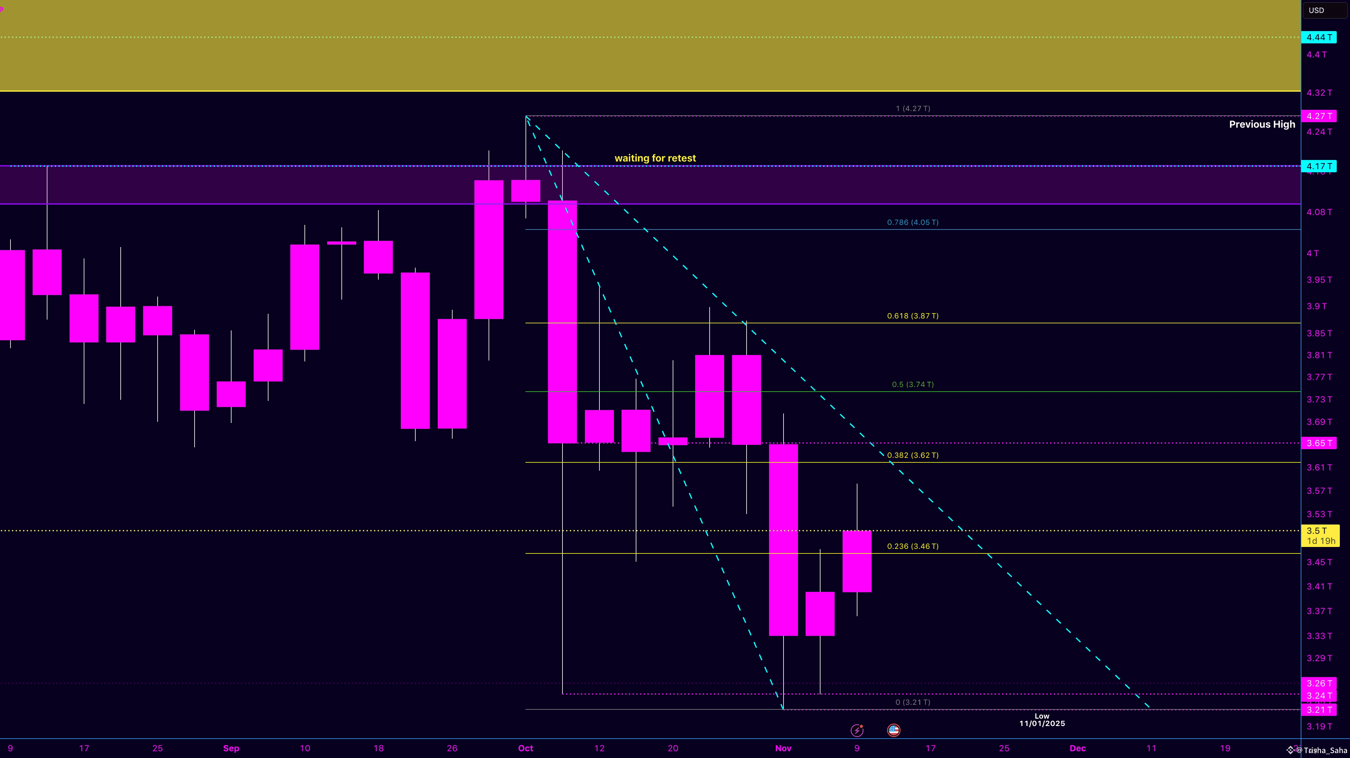 Tra $3.65 T e $3.24 T, abbiamo una chiara zona di liquidità — essenzialmente un intervallo di ri-accumulo dove il denaro intelligente si accumula prima del prossimo rialzo. Nota come il prezzo sia sceso profondamente in quella zona, per poi rimbalzare immediatamente; questa è azione primaverile da manuale, lo stesso schema che segna la fine della maggior parte delle correzioni di metà ciclo.