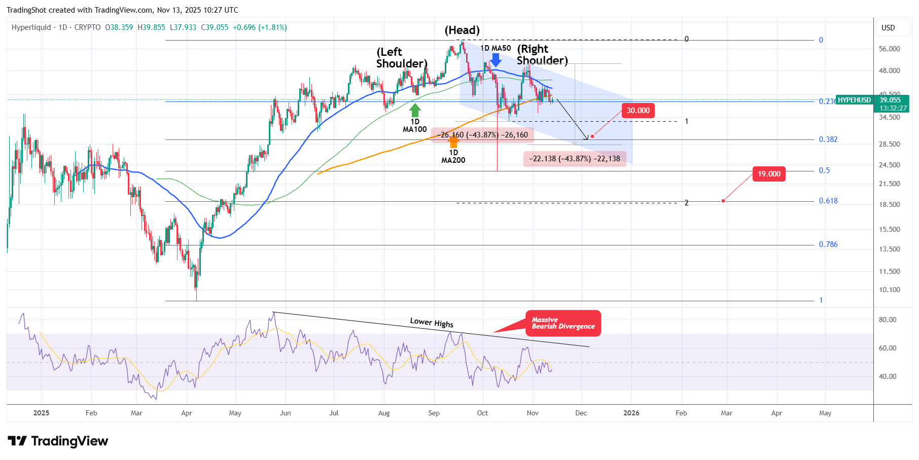 Hyperliquid (HYPEUSD) ha formato un modello di Testa e Spalle (H&S), una struttura altamente simmetrica che ha completato la sua Spalla Destra. Allo stesso tempo, è emerso un Canale Discendente che punta a una diminuzione del -43.87% sulla gamba ribassista attuale, simile alla precedente, mirando a $30.00 a breve termine.