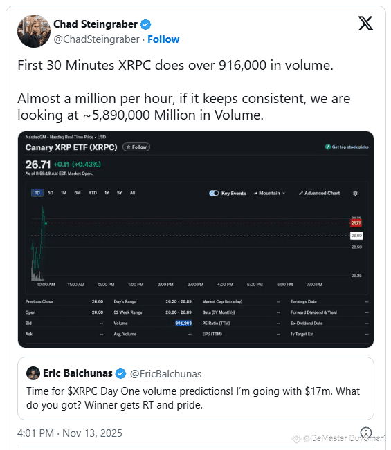 Questo ETF offre agli investitori un'esposizione diretta e regolamentata a XRP senza il fastidio di portafogli o chiavi private. Con un momentum che si avvicina a $1M all'ora, le prime stime indicano che il volume potrebbe raggiungere quasi $5.9M se il ritmo continua. L'analista di Bloomberg Eric Balchunas è andato oltre, proiettando un volume di $17M nel giorno uno se i trader mantengono questo livello di attività.