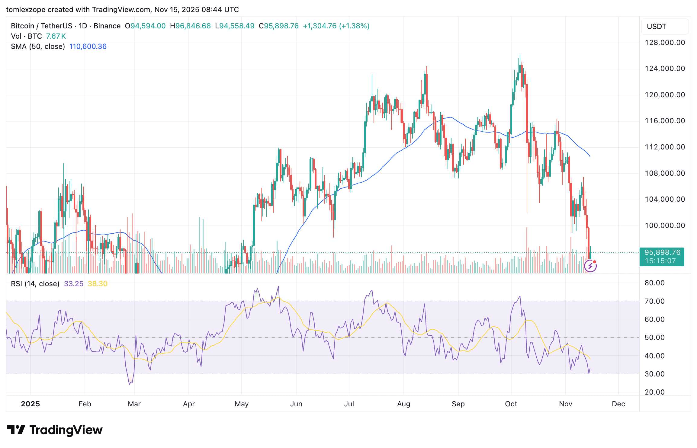 Se non viene introdotta una quantità significativa di liquidità per neutralizzare il dominio dei venditori di Bitcoin, il prezzo di Bitcoin potrebbe subire una correzione ribassista ancora più profonda. Al momento della scrittura, Bitcoin è valutato intorno a $95,700, riflettendo una perdita di quasi il 2% nell'ultimo giorno.