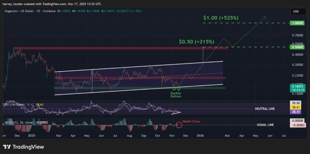 Grafico giornaliero DOGE / USD, il doppio minimo alimenta il modello del canale ascendente. Fonte: TradingView.