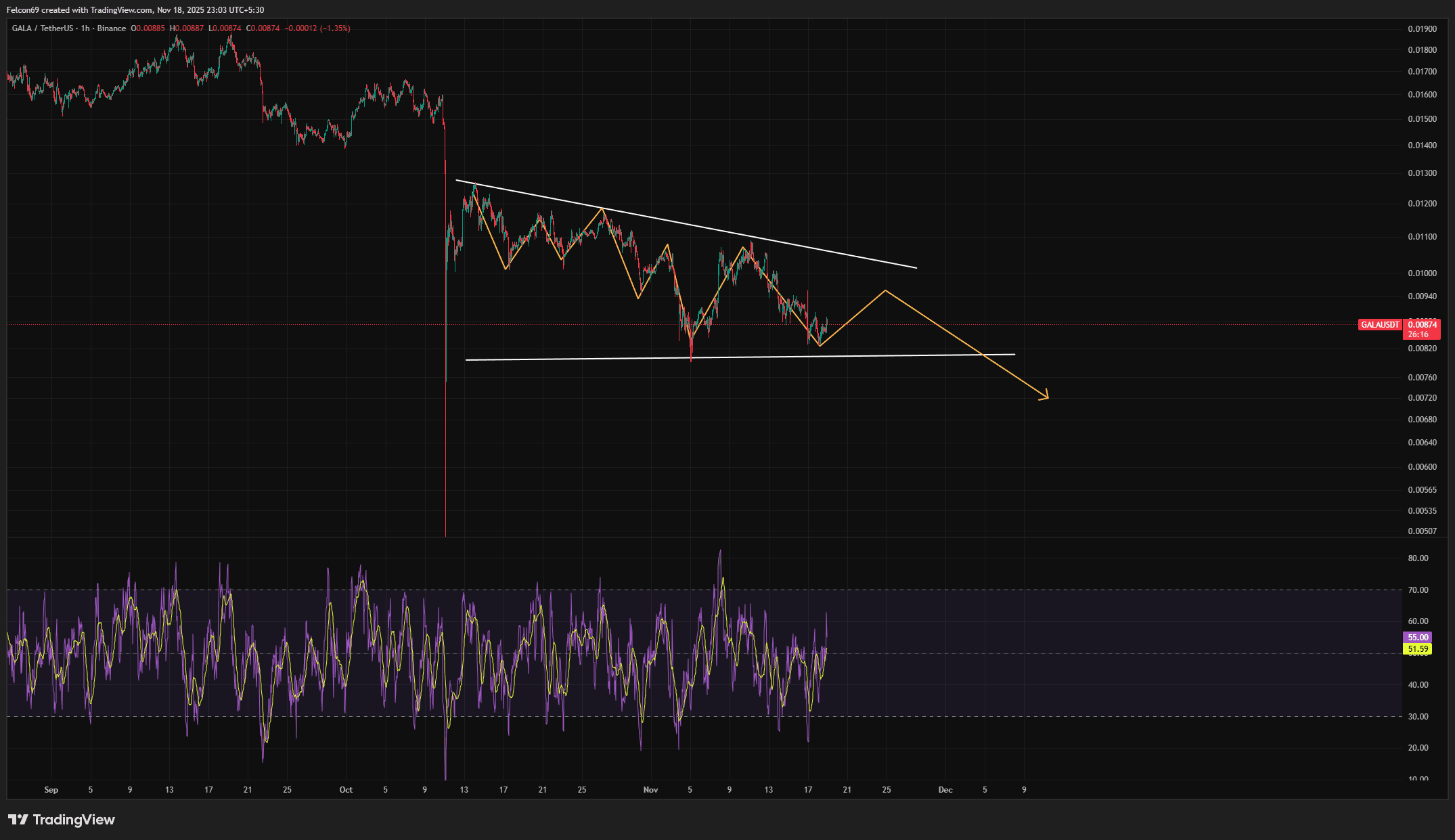 Posso vedere il modello triangolo discendente 📐 di GALA Questo modello ha massimi più bassi che premono contro un forte livello di supporto orizzontale vicino a $0.0089. Questo è tipicamente un modello di continuazione ribassista ⬇️. Il prezzo è attualmente vicino alla linea di supporto. Il percorso previsto (freccia arancione) suggerisce un movimento verso l'alto per ripetere il test della resistenza discendente prima di rompersi 💥 sotto $0.0089, puntando per l'area di $0.0080