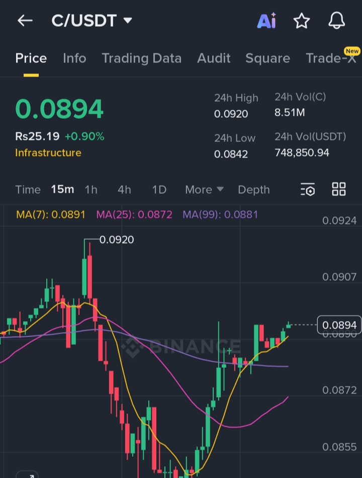 $C sta negoziando a $0.0893 e mostrando un recupero costante dopo essere rimbalzato dalla recente zona di supporto.