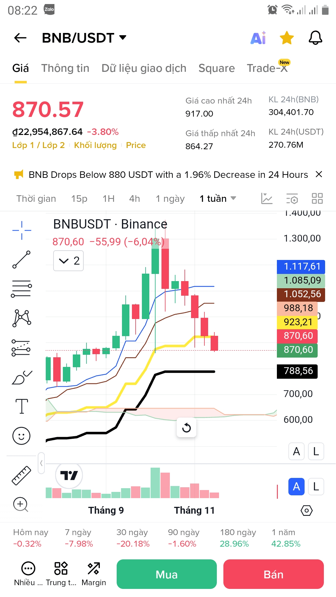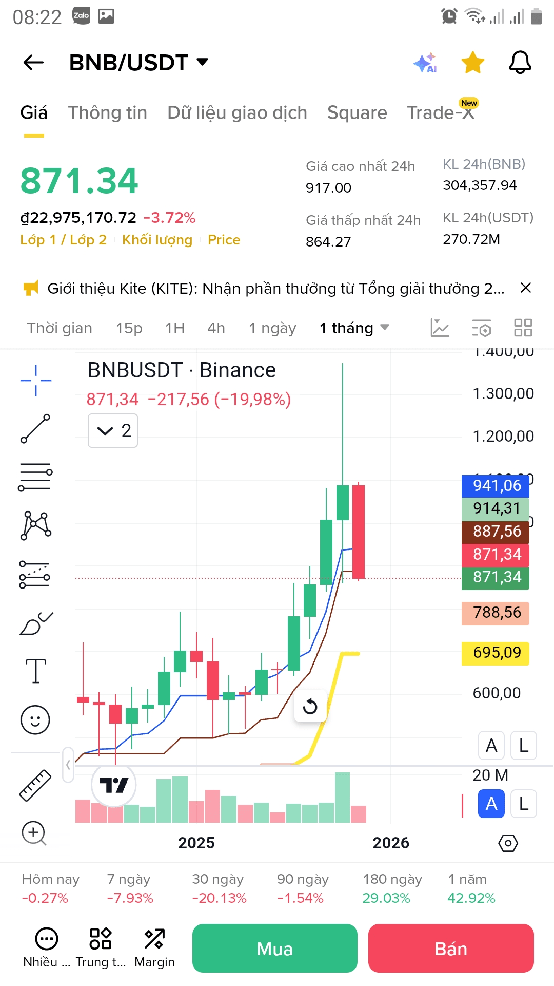 Basato sui dati tecnici, BNB attualmente viene scambiato a 871,34. Nel mese scorso, BNB ha subito notevoli fluttuazioni, con una diminuzione del 19,98%. Tuttavia, negli ultimi 180 giorni, BNB ha mostrato un notevole recupero con un aumento del 29,03%, e nell'ultimo anno, la crescita è stata del 42,92%.