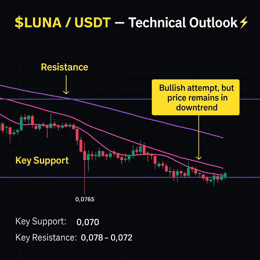 $LUNA mostra un movimento temporaneo verso l'alto, ma forti uscite e una struttura MA ribassista indicano che la tendenza è ancora al ribasso. Senza una pressione di acquisto significativa, il prezzo potrebbe continuare a consolidarsi o tornare a livelli di supporto inferiori. I trader dovrebbero rimanere cauti fino a quando gli afflussi non tornano e le resistenze chiave non vengono superate.