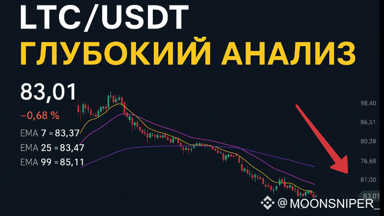Litecoin continua a muoversi in un trend ribassista. Il prezzo attuale è di circa 83$, e tutte le principali medie mobili — EMA 7, EMA 25 e EMA 99 — sono orientate verso il basso. Questo mostra un predominio stabile dei venditori e l'assenza di tentativi di inversione.