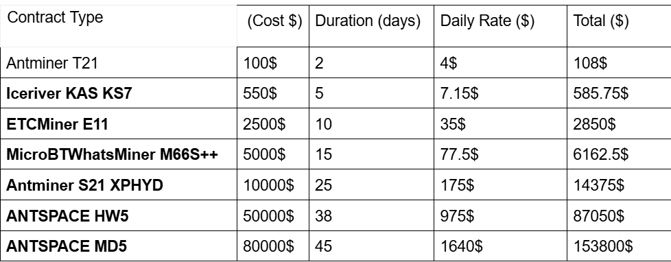Seleziona un contratto di mining che si adatti al tuo capitale e agli obiettivi di profitto. Il sistema assegnerà automaticamente la potenza di calcolo ottimale per garantire una crescita costante dei profitti giornalieri.