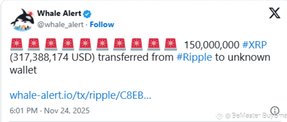 $XRP Un significativo movimento on-chain di XRP segnalato dalla piattaforma di monitoraggio blockchain Whale Alert ha catturato l'attenzione sia per la sua scala che per la sua origine. Secondo il rapporto, 150 milioni di XRP sono stati trasferiti a un wallet non identificato.