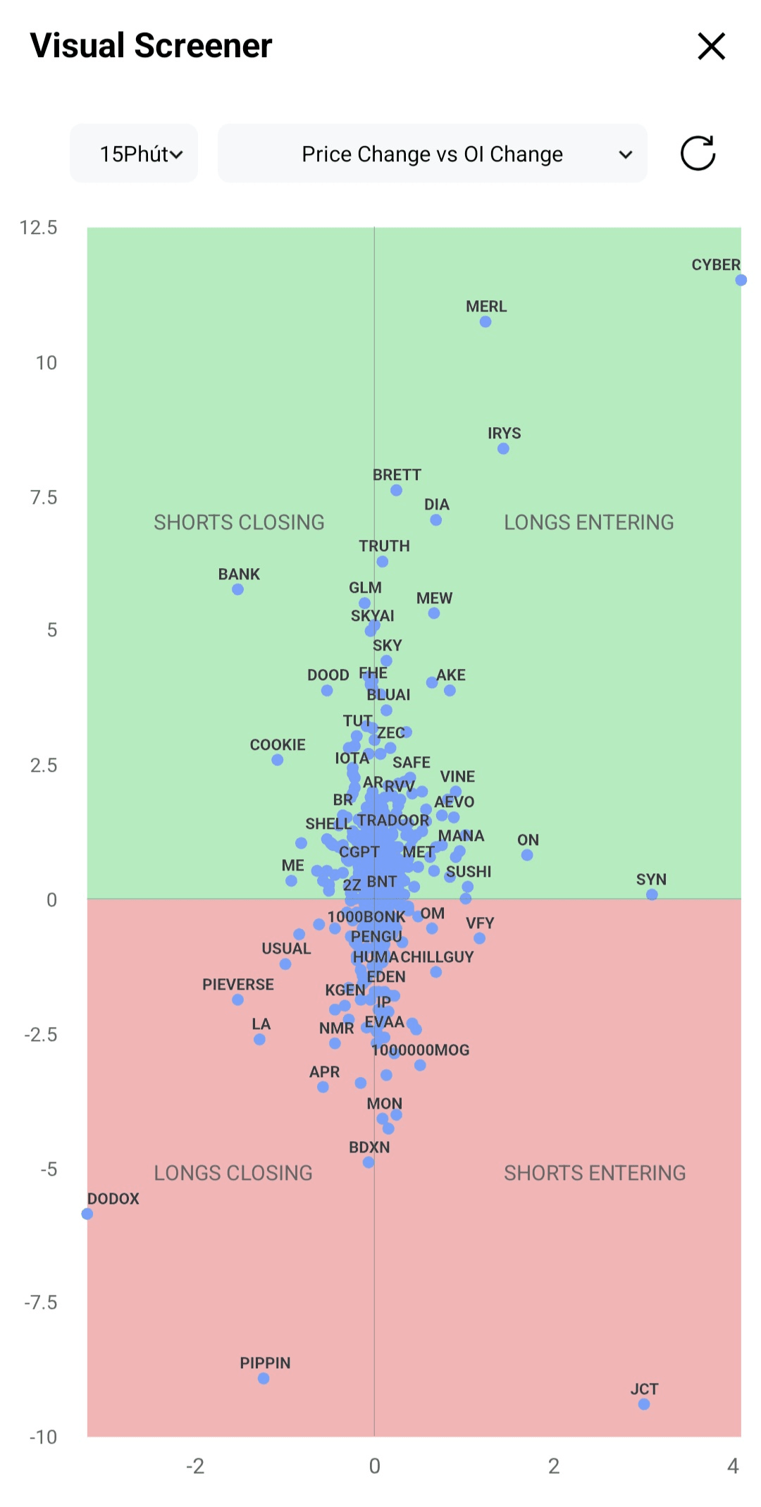 · I punti sul grafico: Ogni punto rappresenta una criptovaluta. La posizione del punto rispetto all'asse 0 indica se si trova in una zona rialzista (sopra 0) o ribassista (sotto 0).