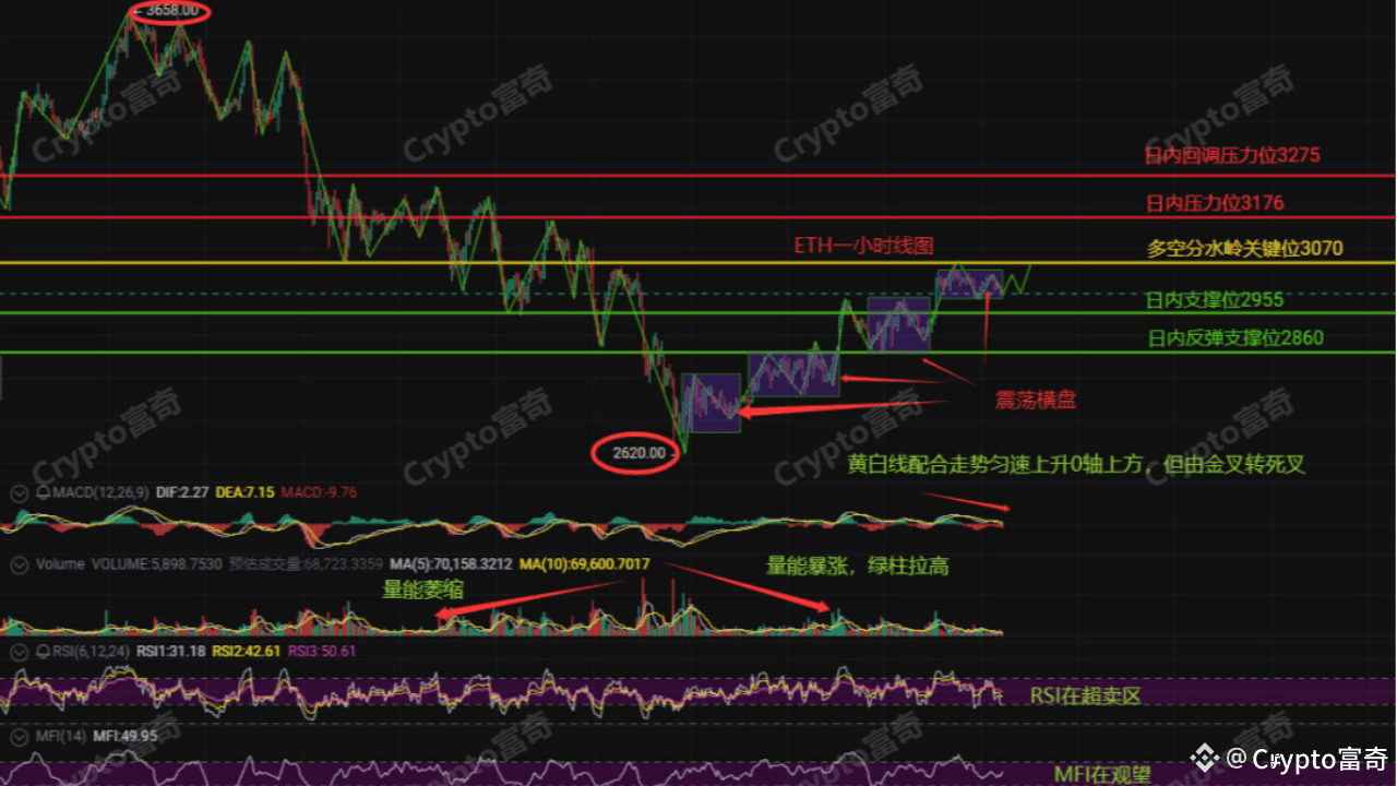 Dall'analisi del grafico a un'ora, $ETH siamo passati da un minimo di 2620 fino a 3070, durante il quale abbiamo vissuto tre fasi di consolidamento tra 2620-2860, 2860-2955 e 2955-3070, il che dimostra che i tori stanno accumulando forza a gradini! Attualmente il prezzo sta testando ripetutamente la soglia di 3070, se qui si stabilisce, il prossimo obiettivo sarà il livello di resistenza a 3176! Ma attenzione al segnale di morte del MACD sopra la linea zero, il volume oscilla tra contrazioni ed esplosioni, dimostrando che la lotta tra tori e orsi è intensa! Anche se l'RSI è nella zona di ipervenduto, il sentiment di attesa del MFI è forte, ci potrebbero essere rischi di un ritracciamento a breve termine!