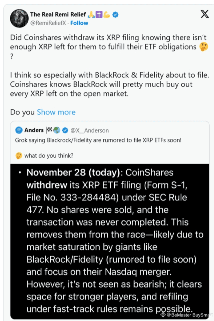 $XRP Remi Relief (@RemiReliefX) ha suscitato una nuova ondata di interesse per XRP. Ha sottolineato il ritiro della domanda ETF di CoinShares per XRP e ha sollevato una domanda che ha attirato immediatamente l'attenzione. Ha esaminato il tempismo e ha chiesto se la decisione fosse legata a pressioni di offerta che potrebbero aumentare una volta che i principali gestori di attivi entrano nel mercato.