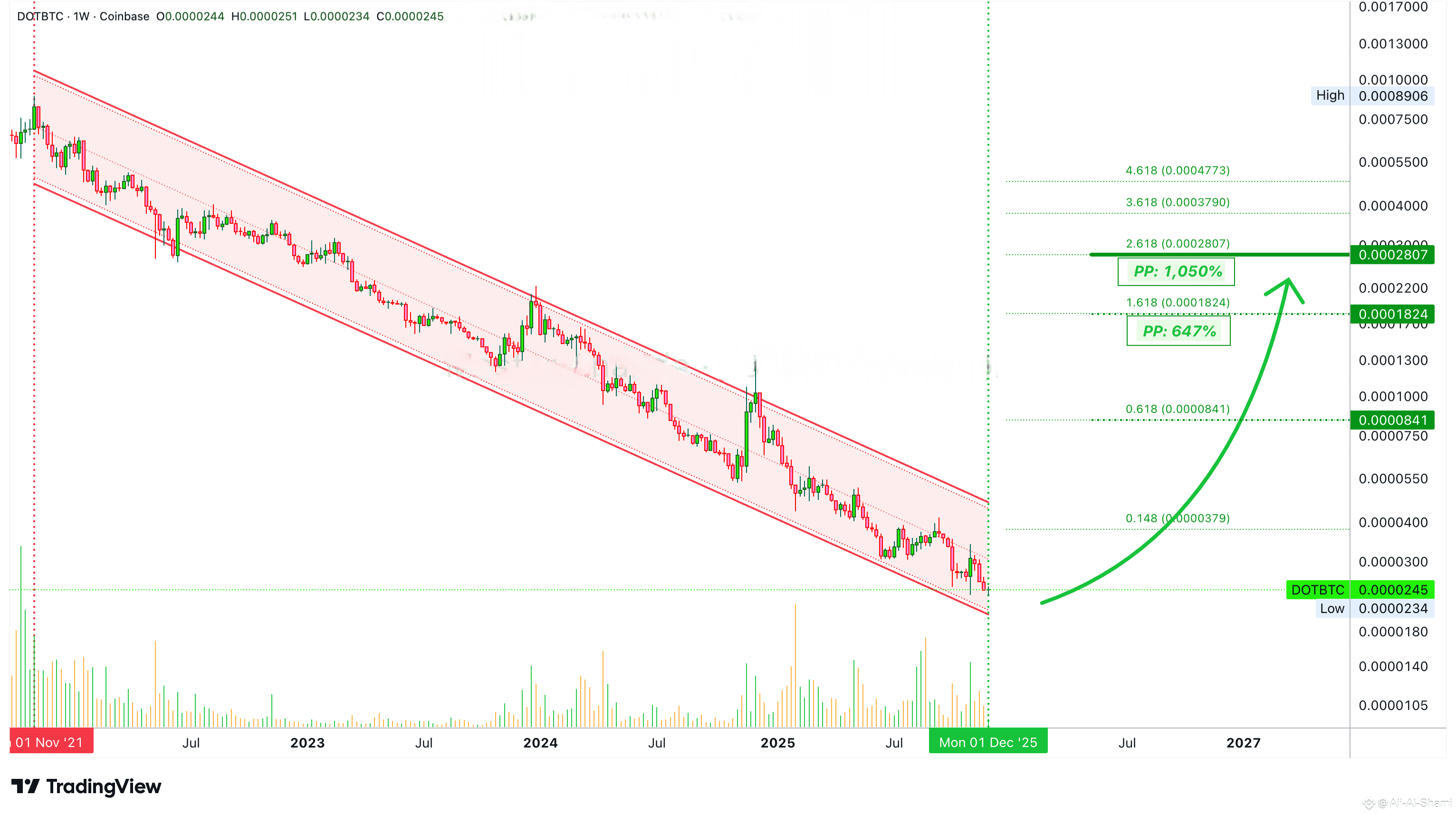 Quindi, Polkadot sta scendendo da oltre quattro anni, poco più di quattro anni sul suo coppia di trading BTC, DOTBTC. Ha raggiunto il suo minimo storico questa settimana. Ora! Stiamo guardando a un potenziale vero fondo. Per questo motivo ho condiviso i numeri di trading completi sopra perché catturare un progetto come questo al fondo può cambiare la vita...