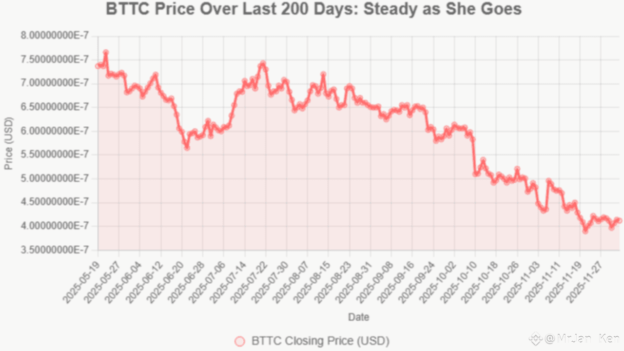 Immagina questo: BTTC ha iniziato il 2025 come un bradipo sonnacchioso sotto caffeina – oscillando attorno a $0.00000074 (questo è 7.4e-7 USD per i nerd della matematica). È sceso, ha danzato, ha persino flertato con un mini-rally a luglio, raggiungendo un picco vicino a $0.00000084 prima che la gravità (e gli orsi del mercato) lo riportassero giù. Avanti veloce fino ad ora, e il nostro eroe si trova a $0.000000412 – una solida diminuzione del 44% dai massimi di gennaio, ma sorprendentemente stabile nel caos delle criptovalute.