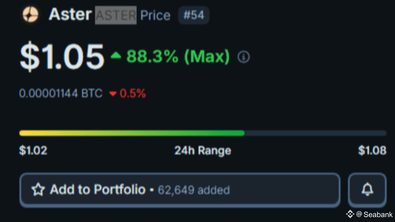 Prezzo: 1,06 USD (medio da fonti diverse), volume 24h ~350-392M USD. Il mercato complessivo ha mostrato un leggero recupero (+0,25-6%), ma $ASTER ha sovraperformato con +7,4% oggi, inversione di tendenza con un calo del 9,5% la settimana scorsa.