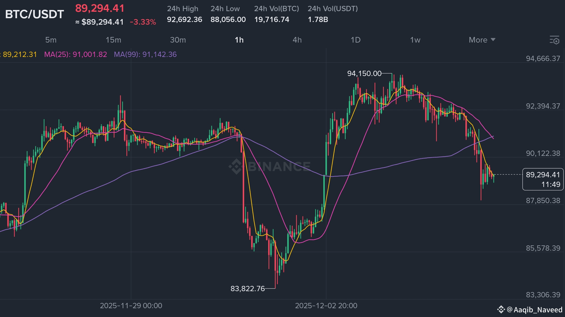 Rottura della MA: Il prezzo è sceso al di sotto della MA(99) (la linea viola, attualmente vicino a $91,142.36) e della MA(25) (la linea rosa, vicino a $91,001.82). Rompere al di sotto di queste linee di supporto a lungo termine è un segnale ribassista e spesso accelera le vendite.