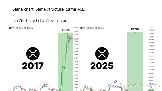 The comparison surfaced after ChartNerd highlighted the striking symmetry between XRP’s 2017 accumulation and its 2025 structure. His chart shows a clear four-wave formation on the five-day time frame, with each wave echoing the rhythm of the past. The visual alignment is strong enough that many analysts are reviewing the pattern with fresh urgency.