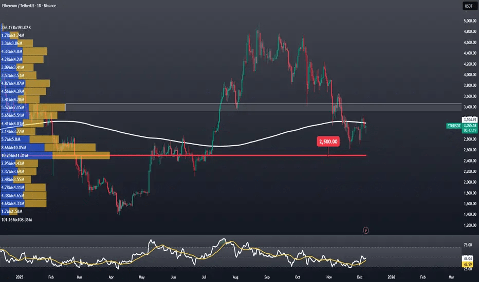 Guardando all'azione recente dei prezzi di ETH, questo livello si allinea con un nodo ad alto volume sul FRVP, rendendolo un'area chiave di interesse. Rimanere sopra di esso supporta lo scenario rialzista — ma il fatto che ETH non sia stata in grado di spostare questa “zona di liquidazione ad alto volume” verso l'alto per mesi significa che agisce anche come un magnete.