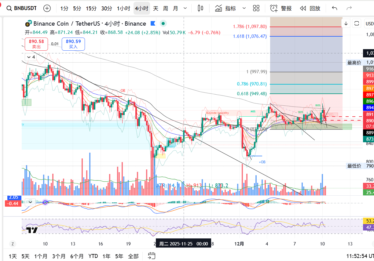 BNB: movimento sincronizzato, guardando sopra 1000-1050, supporto 870-883.