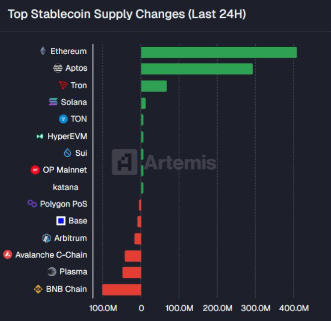 Dalla parte delle altcoin: nelle ultime 24 ore ETH e Aptos hanno guidato l'afflusso di stablecoin, un chiaro segnale rialzista.
