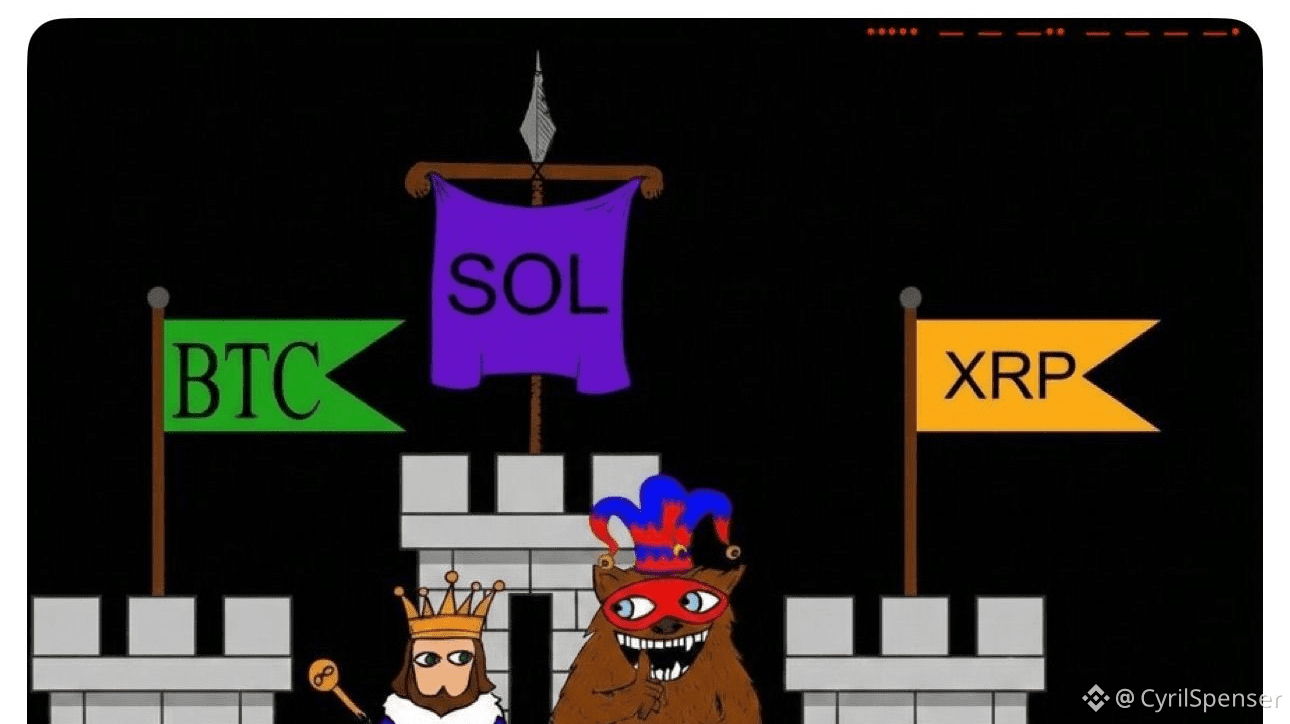 SOL prende il trono come fonte di potere. BTC detiene il vault come riserva a lungo termine. XRP si trova sui binari come liquidità che si muove nell'ombra. Ogni ruolo è importante per il prossimo ciclo, e l'immagine suggerisce un cambiamento più grande in corso.