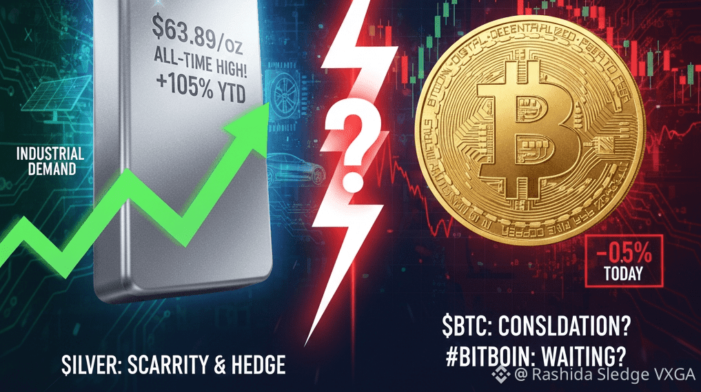 L'argento sta raggiungendo i massimi storici vicino a $63.89/oz (in aumento del +105% dall'inizio dell'anno!), guidato da una tempesta perfetta di scarsità. Nel frattempo, #Bitcoin ($BTC) si sta consolidando attorno a $92,000, con la capitalizzazione del mercato delle criptovalute che mostra segnali misti.