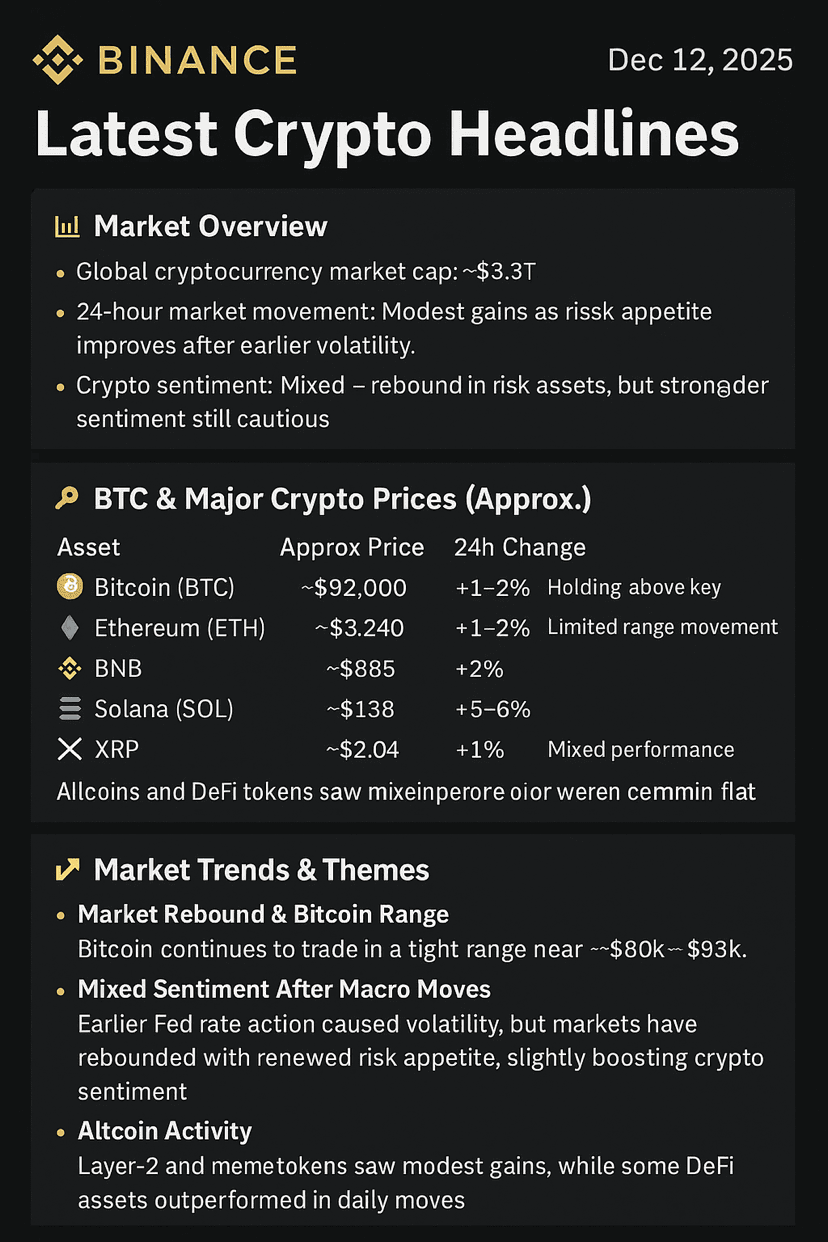 Ecco un riepilogo aggiornato del mercato delle criptovalute in stile Binance per il 12 dicembre 2025 basato sui dati di mercato più recenti e sulle notizie di criptovalute in tendenza: