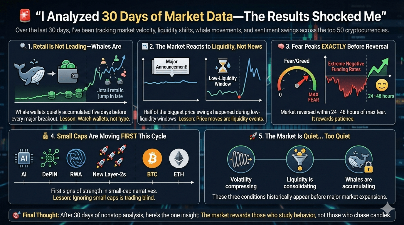 Negli ultimi 30 giorni, ho monitorato la velocità del mercato, i cambiamenti di liquidità, i movimenti delle balene e le variazioni di sentiment attraverso le 50 principali criptovalute… e quello che ho trovato mi ha onestamente sorpreso più di qualsiasi tweet “rialzista” potesse mai fare.
