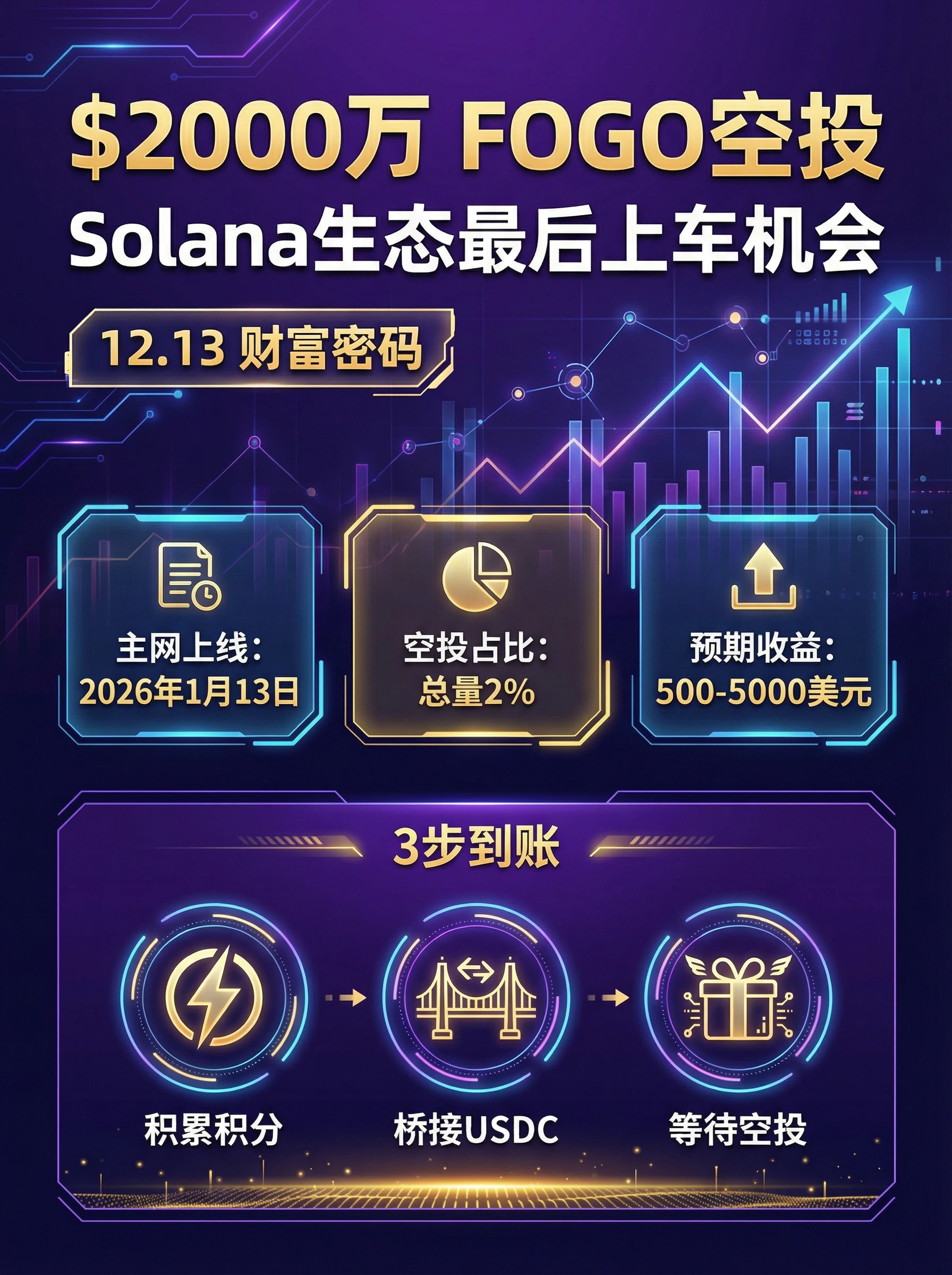 Airdrop FOGO: dedica 10-15 minuti, capitale di 50-200 USDT o zero costi per completare i compiti. L'operazione chiave è il bridging di USDC per guadagnare punti e il check-in quotidiano. Account ufficiale @FogoChain