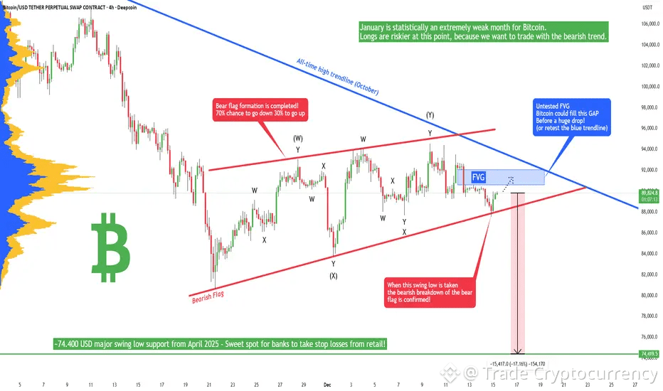 From the Elliott Wave point of view, this bear flag seems to be a complex corrective pattern. To be honest, I don't see any signs of strength, such as an impulse wave or a leading diagonal wedge pattern. I am currently bearish on Bitcoin, and I expect a pretty significant drop in the coming weeks! Especially January is statistically an extremely weak month for Bitcoin.