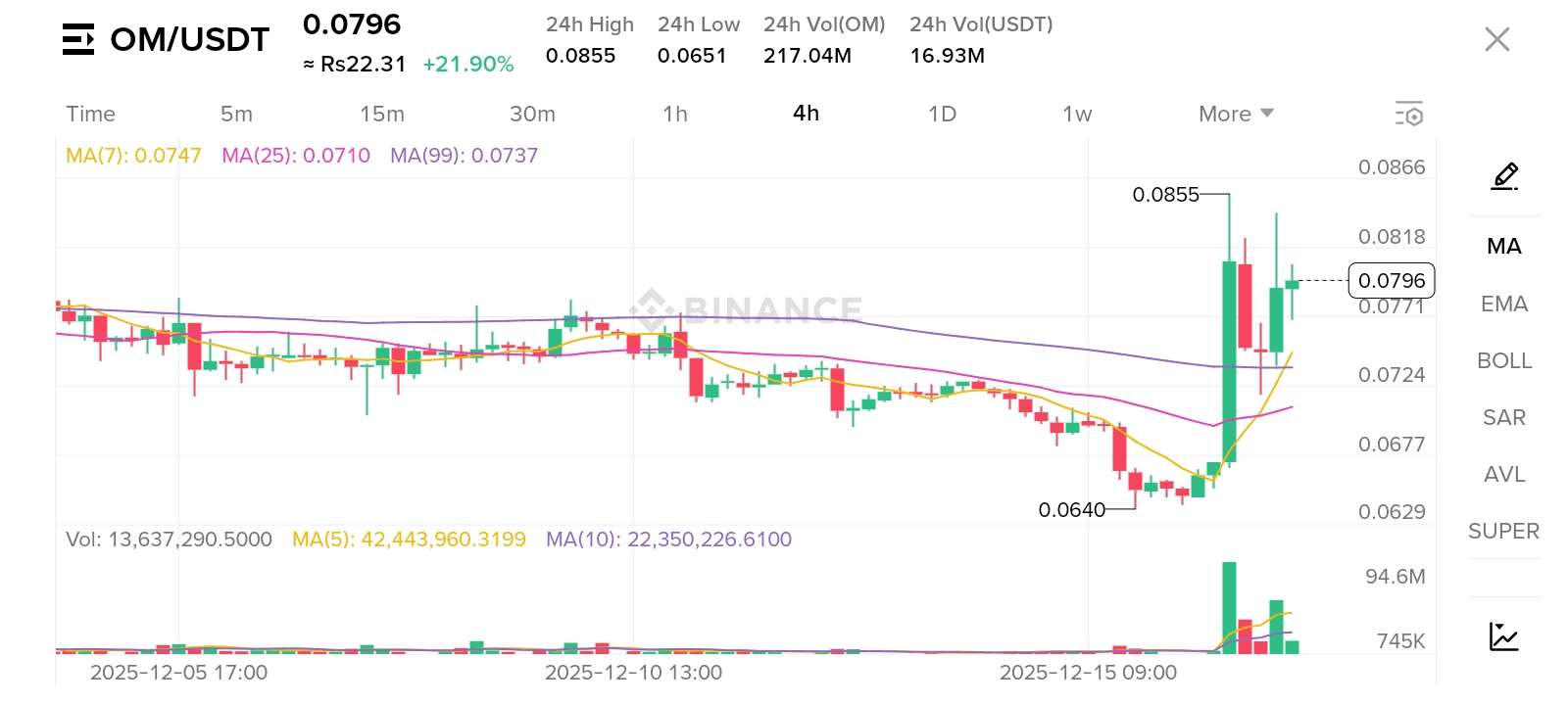 * Azione Prezzo Corrente: Il grafico a 4 ore mostra $OM che scambia a $0.0796, riflettendo un significativo +21.90% di aumento nelle ultime 24 ore.
