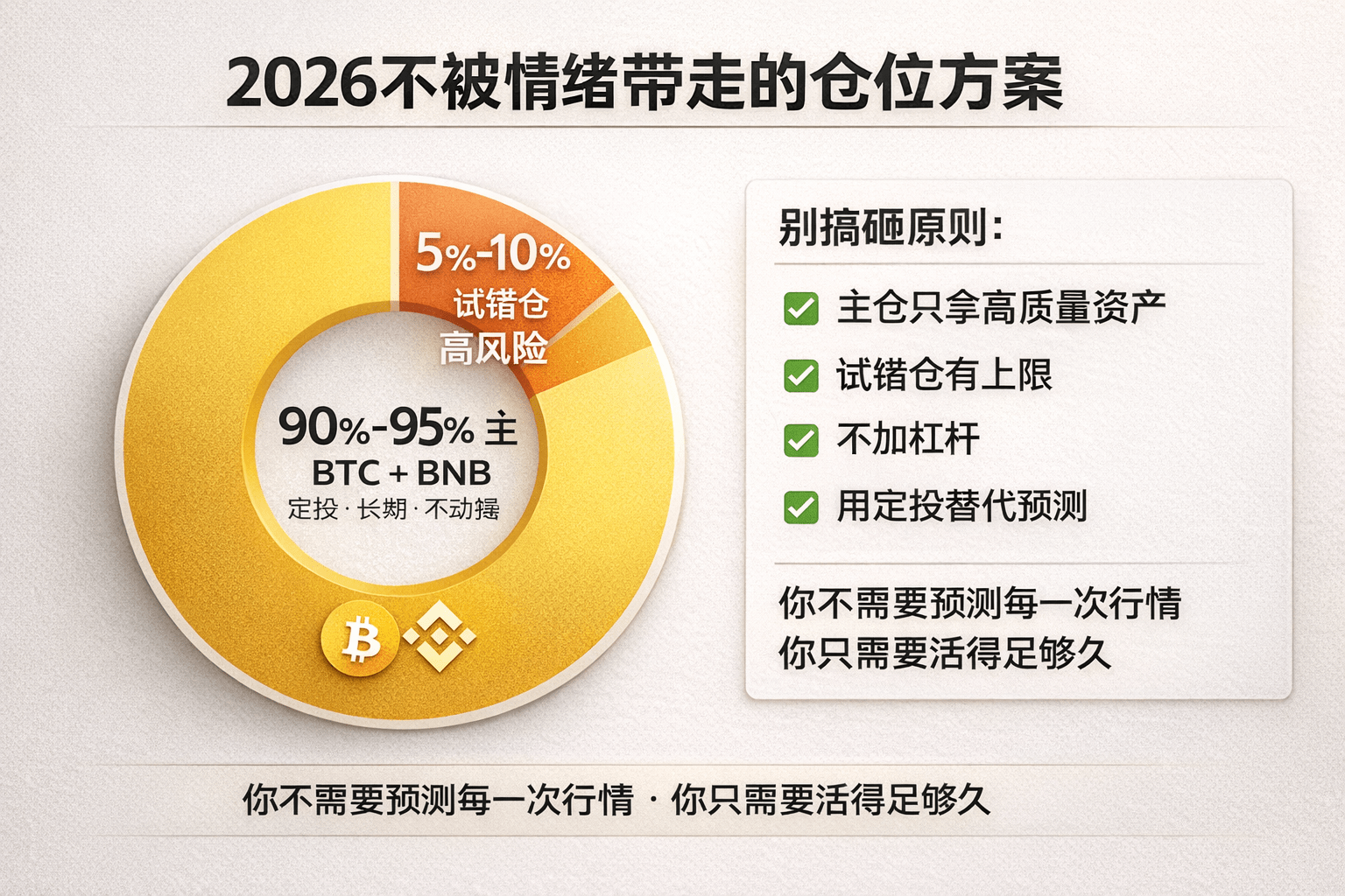 • Il portafoglio principale deve contenere solo asset di alta qualità: cose come BTC e BNB, di cui puoi spiegare chiaramente la logica, meritano di essere la base.