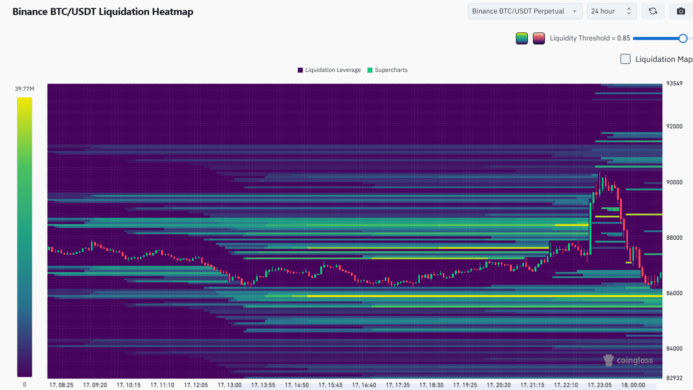 Caso Ribassista: Poiché la liquidità superiore è stata "toccata," il mercato potrebbe ora essere attratto verso la zona ad alta densità a $86.000 per eliminare le posizioni long tardive.
