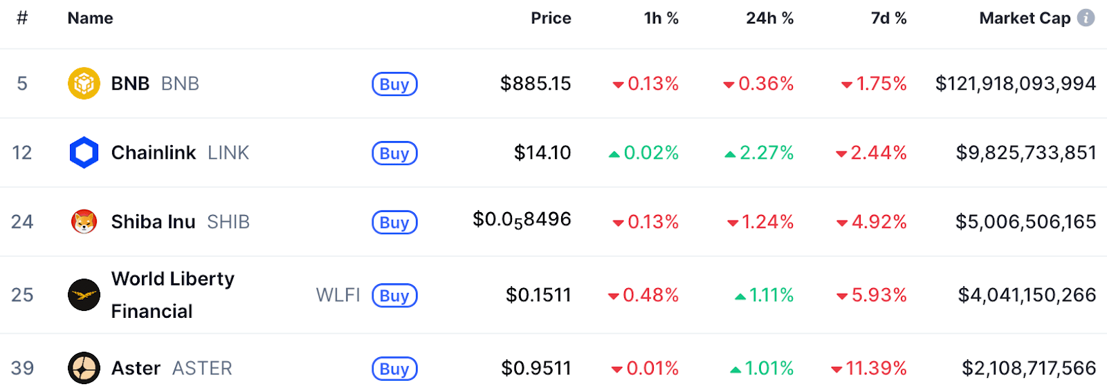 Nel frattempo, la maggior parte dei principali token dell'ecosistema BNB è in rosso questa settimana, con Aster (ASTER) che mostra una particolare debolezza, perdendo l'11,4% rispetto alla settimana precedente (WoW).