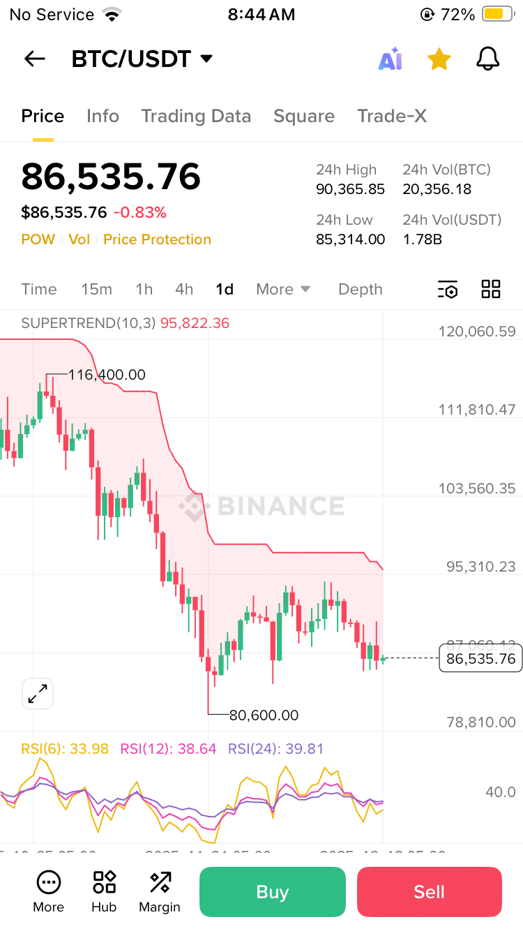 Nel grafico giornaliero, Supertrend (10,3) è diventato ribassista vicino a $95,800. Da allora, ogni rimbalzo è stato respinto. I seguaci della tendenza vendono quando questo accade — senza emozioni coinvolte.