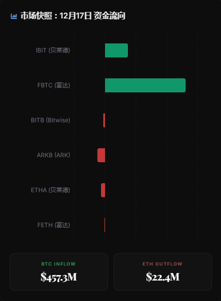 L'effetto di aspirazione del bitcoin si è nuovamente affermato: un flusso netto di 457,3 milioni di dollari in un solo giorno dimostra in modo convincente che gli istituti continuano a scommettere sul racconto del 'oro digitale'. Particolarmente significativo è il fatto che Fidelity con il suo FBTC abbia raccolto 391,5 milioni di dollari, mentre il suo concorrente BlackRock con IBIT ha ottenuto 111,2 milioni di dollari, contribuendo insieme a creare una solida linea di acquisto, che evidenzia l'elevata richiesta da parte dei clienti dei principali gestori finanziari istituzionali nei confronti degli asset chiave.