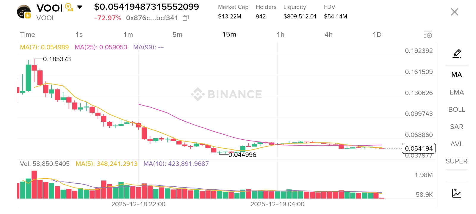 $VOOI è un aggregatore DEX Perp cross-chain. L'attuale azione del prezzo è tipica di un token appena quotato (quotato su scambi importanti come Gate.io e Binance Alpha ieri, 18 dicembre). La "caduta del 72,97%" mostrata nel tuo screenshot è la fase standard di "scoperta del prezzo" in cui il pump iniziale della quotazione incontra una forte pressione di vendita da parte dei richiedenti airdrop e dei primi investitori seed.