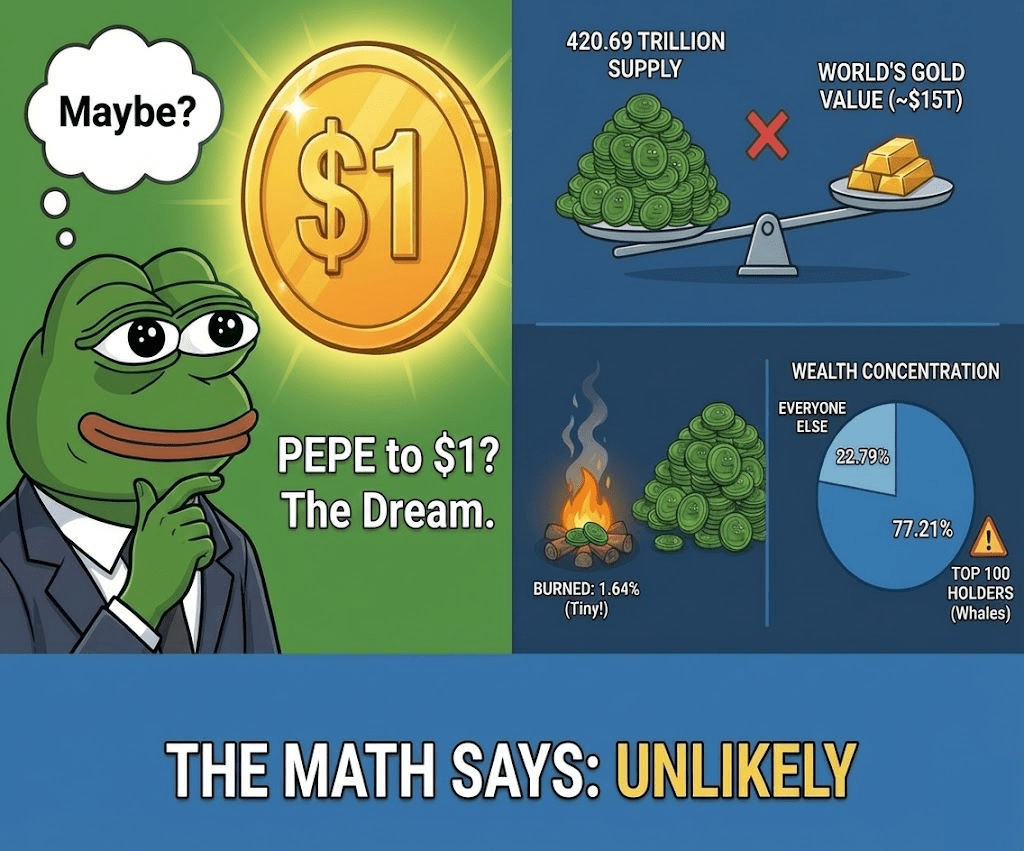 Il Confronto: Per mettere le cose in prospettiva, il valore totale di tutto l'oro nel mondo è stimato intorno ai $14–$15 trilioni. Affinché PEPE raggiunga $1, dovrebbe valere 30 volte più di tutto l'oro sulla Terra. Questo è praticamente impossibile nelle attuali condizioni economiche globali.