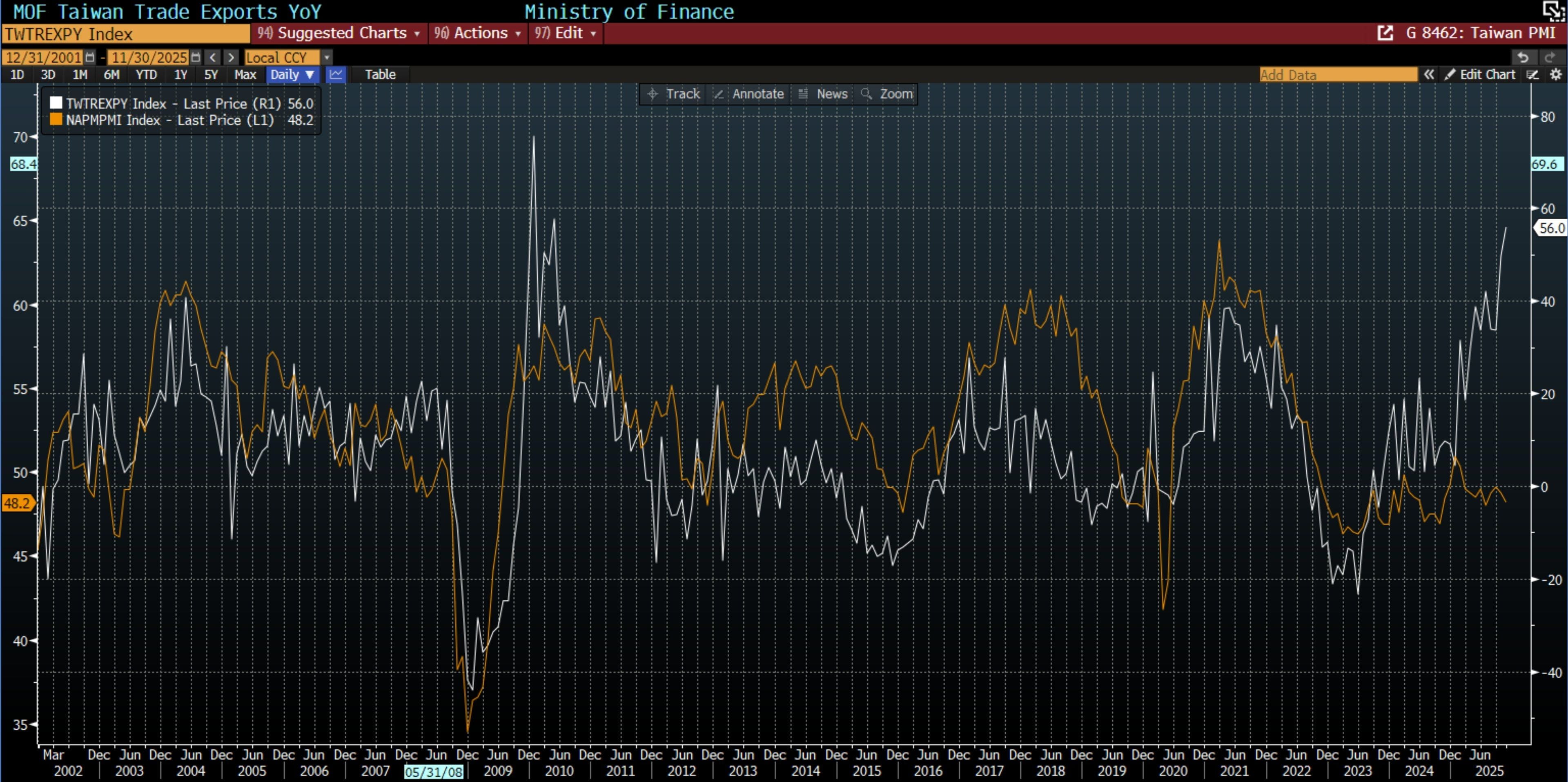 Personalmente sono piuttosto ottimista riguardo al 2026, e c'è una grande probabilità che nel 2026 ci sarà un mercato toro folle 🐂 (proprio quello che tutti stanno aspettando), ho visto un'immagine interessante su Bloomberg (vedi figura due), il tasso di crescita delle esportazioni di Taiwan (TWTREXPY) e l'indice manifatturiero ISM degli Stati Uniti (NAPMPMI) mostrano un'affascinante corrispondenza, e quest'anno il tasso di crescita delle esportazioni di Taiwan ha continuato a raggiungere nuovi massimi, ci sarà una possibilità che l'indice ISM degli Stati Uniti possa seguirne l'andamento? Se l'ISM inizia a riprendersi, l'economia degli Stati Uniti entrerà in una fase di crescita, combinata con un ciclo di riduzione dei tassi, come può il mercato non seguire?!