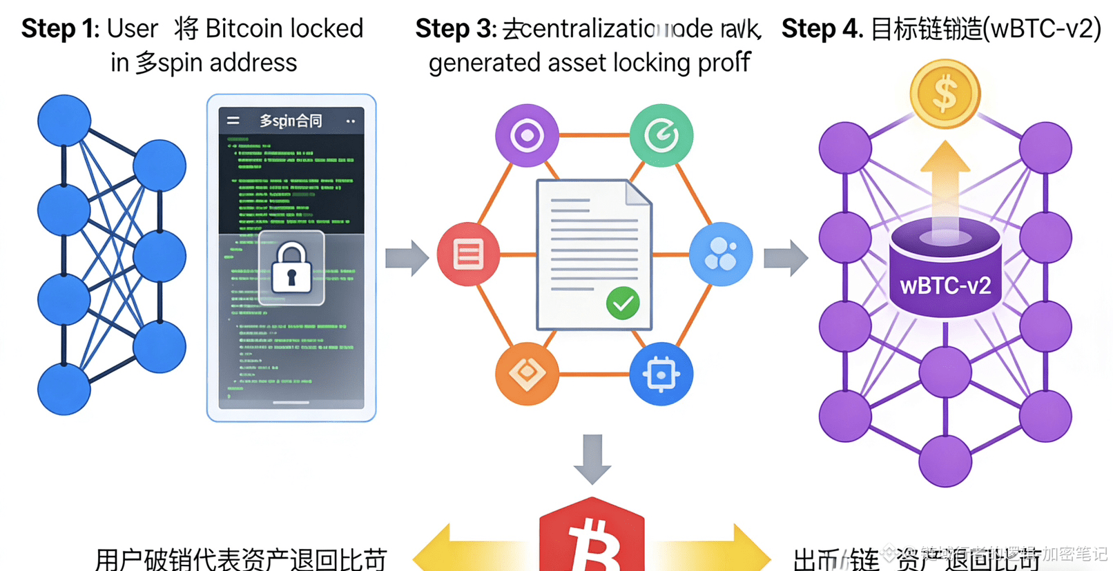 4. 反向赎回:用户随时可销毁代表资产,由节点网络在比特币链上释放原资产。