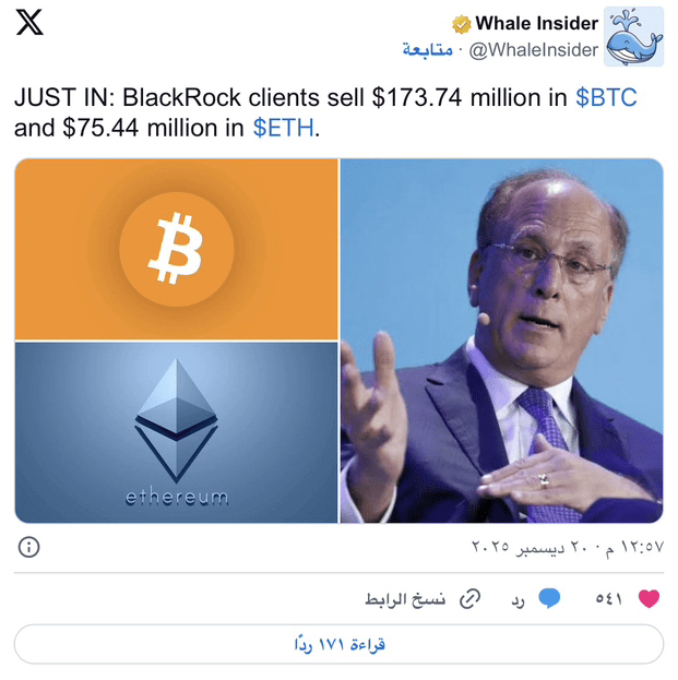Investitori collegati a BlackRock hanno provocato una reazione forte nei mercati delle criptovalute dopo aver venduto grandi quantità di Bitcoin ed Ethereum. I dati mostrano che i clienti hanno venduto Bitcoin per un valore di 173,74 milioni di dollari e Ethereum per 75,44 milioni di dollari. Questo movimento ha rapidamente attirato l'attenzione degli investitori, data l'ampia influenza di BlackRock sui flussi di capitale istituzionali a livello globale. I partecipanti al mercato stanno attualmente analizzando se questo cambiamento rifletta una presa di profitto o una cautela più profonda.