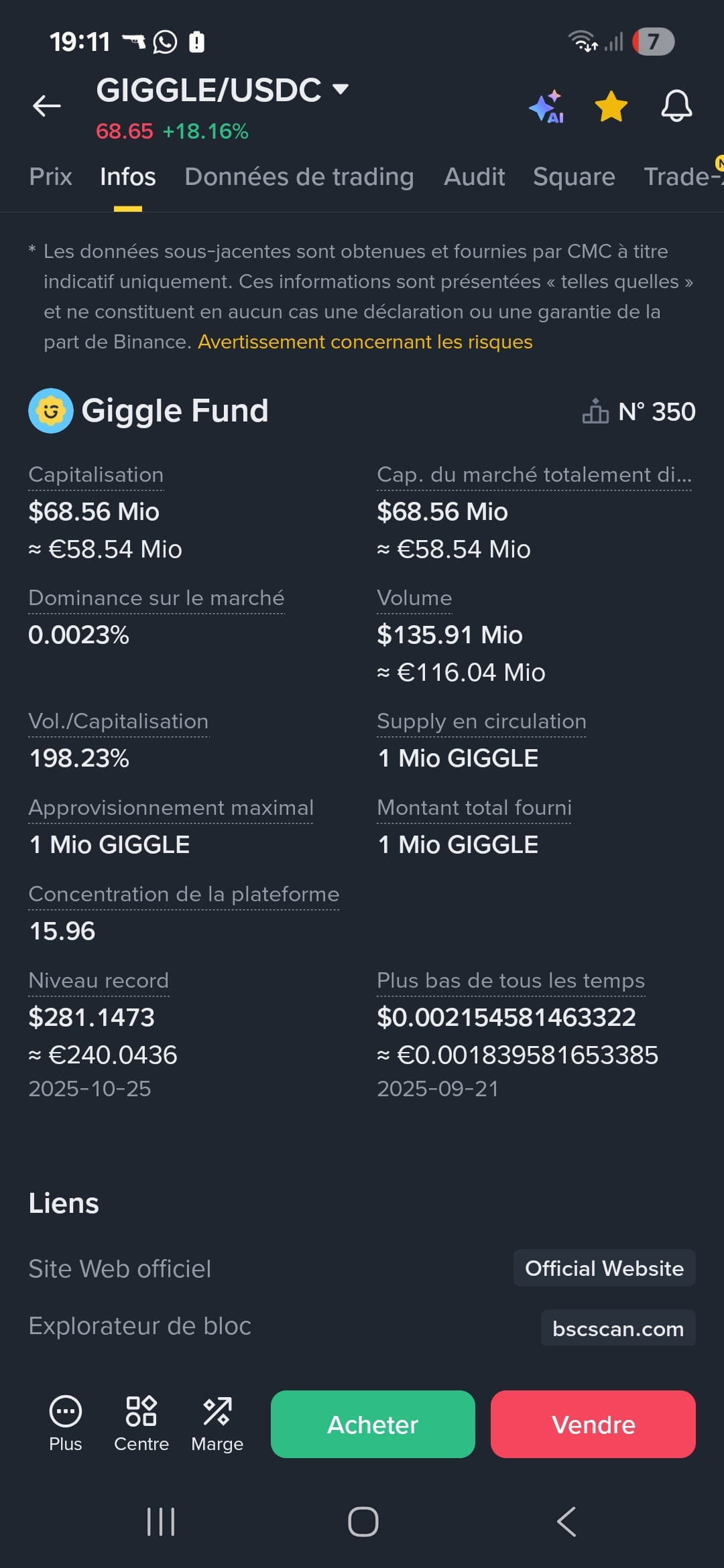 Con una capitalizzazione di mercato di 68,56 milioni di dollari, un volume di scambio giornaliero che spesso supera i 100 milioni e una posizione intorno alla 350ª nel mondo, GIGGLE si impone come uno dei memecoin più dinamici dell'ecosistema BNB Chain.