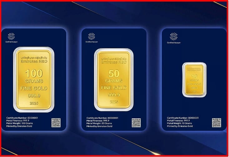 disponibile in taglie da 10g, 50g e 100g. Marchiato 'Emirates NBD Gold', questa nuova offerta promuove opportunità per risparmiatori e investitori combinando la proprietà di un asset tangibile con la credibilità di una grande istituzione. Ogni lingotto, offerto in pesi da 10, 50 e 100 grammi, porta il logo Emirates NBD e include un certificato di autenticità e proprietà numerato in modo univoco.
