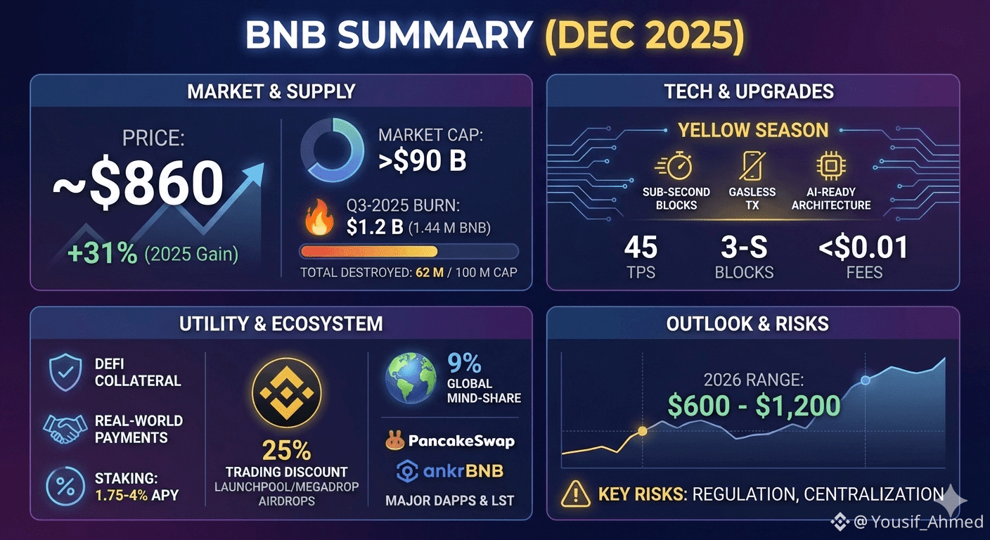 Supply: 1.44 M BNB ($1.2 B) burned in Q3-2025; 62 M BNB already destroyed toward 100 M cap.