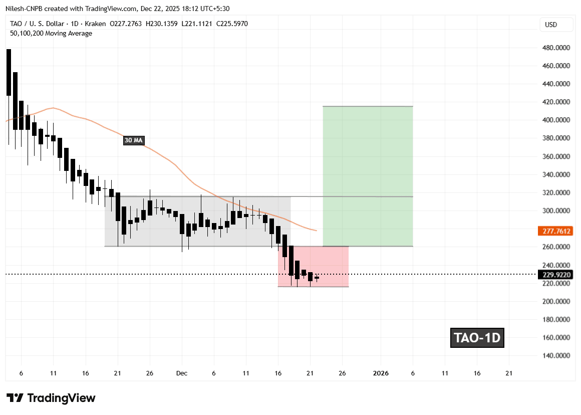 Affinché lo scenario rialzista guadagni slancio, TAO deve riconquistare il livello di $260.39 e stabilire accettazione sopra la media mobile a 30 giorni in calo, che attualmente funge da resistenza dinamica. Un movimento sostenuto di ritorno nel range precedente suggerirebbe che la fase di manipolazione è probabilmente completa e che il mercato potrebbe stare transizionando verso la fase di espansione del modello.