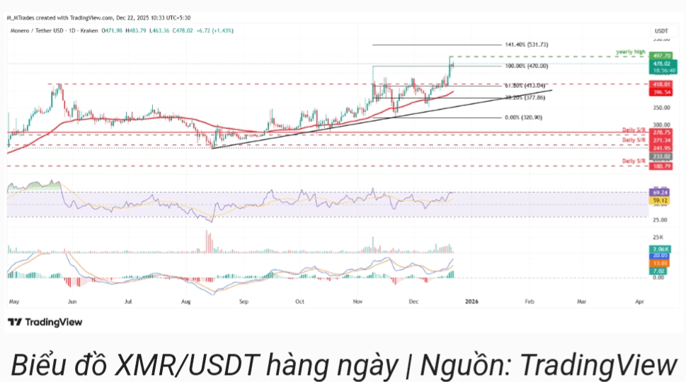 Al momento della scrittura, Monero sta scambiando intorno a 478 $, mantenendo una forte struttura rialzista sopra le medie mobili chiave.