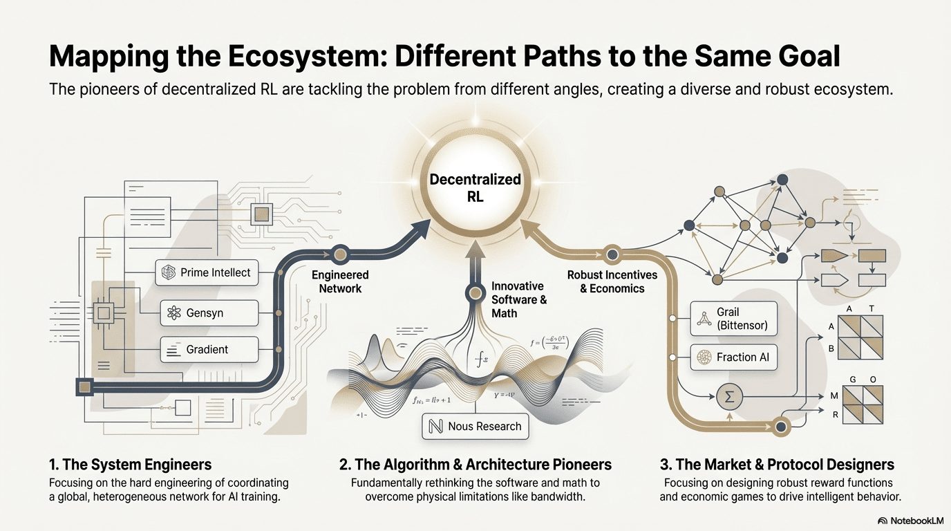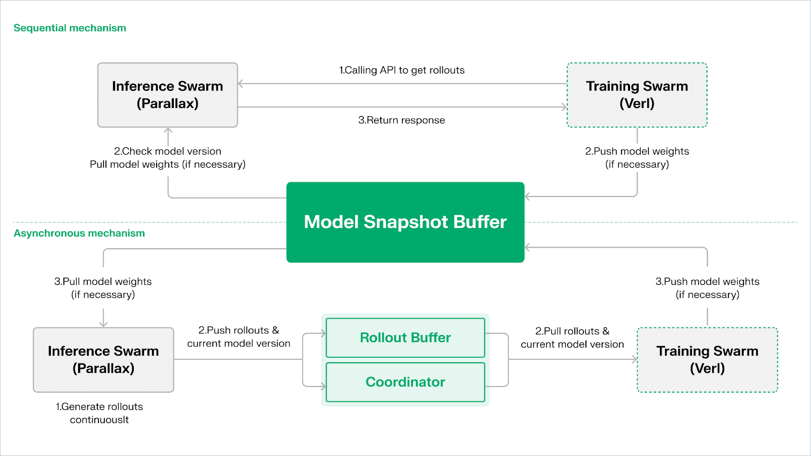 Rollout a bassa comunicazione e parallelo esternalizzato a GPU di consumo globali, l'aggiornamento dei parametri ad alta larghezza di banda è concentrato su pochi nodi di addestramento, così come da Prime Intellect con il suo attore-learner asincrono e l'architettura a doppio sciame di Gradient.