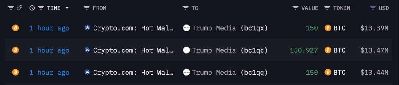 I trasferimenti, eseguiti entro un breve lasso di tempo, hanno totalizzato più di 450 $BTC e sono stati suddivisi tra diversi indirizzi collegati a Trump Media. Ai prezzi attuali, il valore combinato delle partecipazioni supera i 40 milioni di dollari, collocando istantaneamente l'azienda tra l'elenco crescente di società quotate in borsa che detengono Bitcoin nel loro bilancio. Le transazioni sembrano essere originate da portafogli hot, suggerendo un acquisto diretto piuttosto che un trasferimento interno.