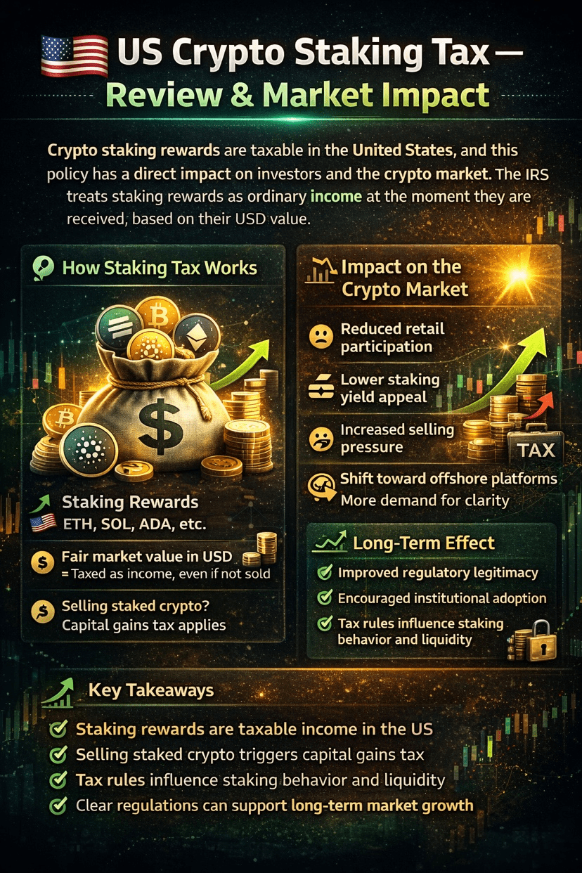 Quando guadagni crypto dal staking (ETH, SOL, ADA, ecc.), il valore equo di mercato della ricompensa in USD è tassato come reddito, anche se non lo vendi. Se successivamente vendi quelle ricompense, si applica anche la tassa sulle plusvalenze.