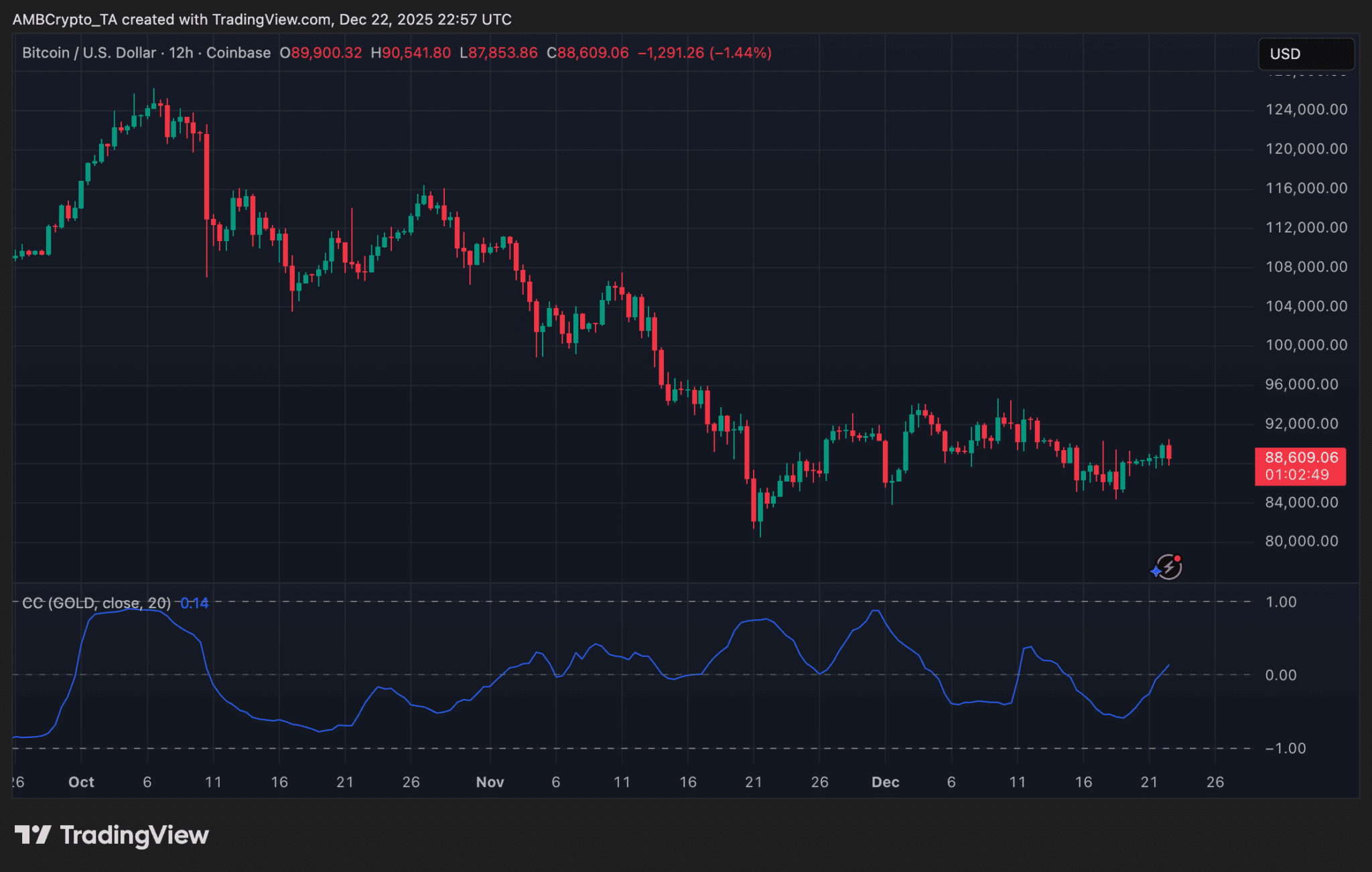 Nel timeframe delle 12 ore, la correlazione BTC Oro è scesa a ~0,14, passando da livelli positivi visti a fine novembre.