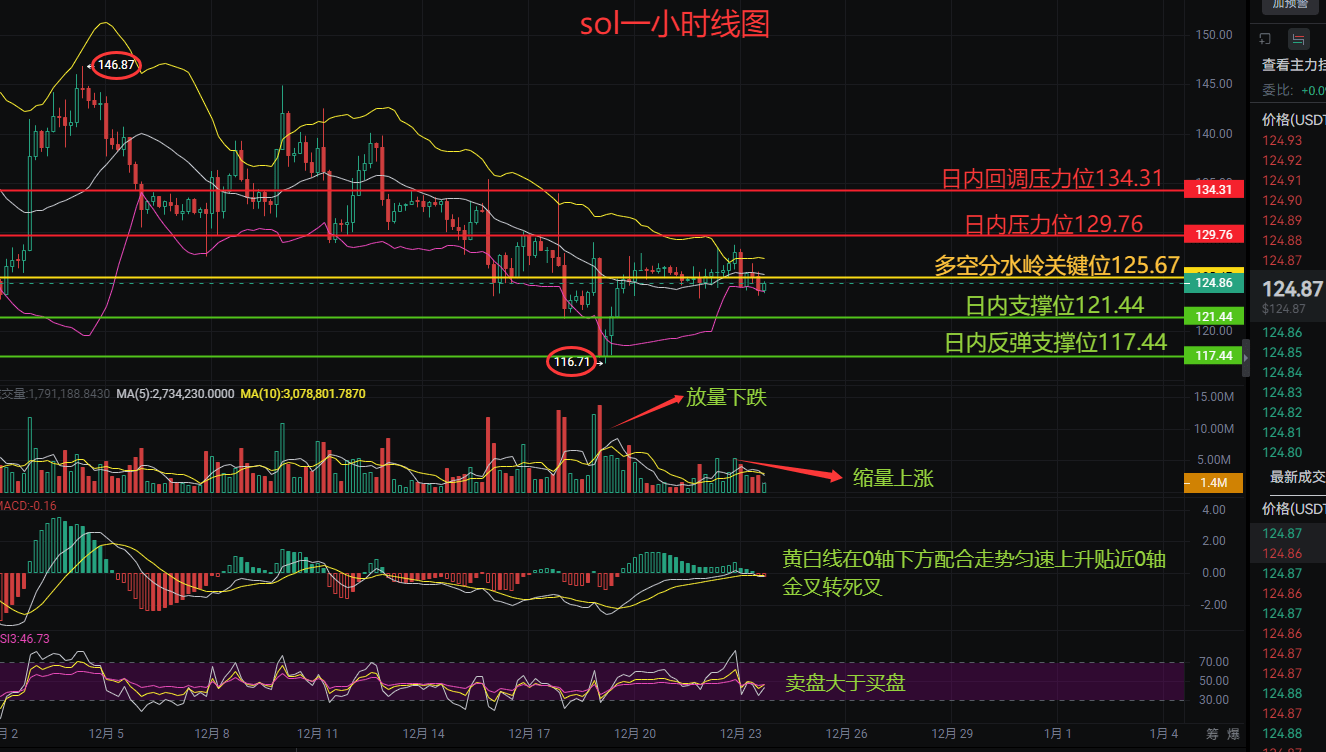 Penso che oggi la probabilità che SOL segua lo scenario di 'prima scendere e poi rimbalzare' sia alta. È probabile che il mercato tocchi prima il supporto, ci sarà sicuramente un rimbalzo nell'intervallo 121.44-117.44. Se la forza del rimbalzo è debole, 129.76 sarà il secondo livello di apertura short; se si stabilizza sopra 125.67 con volume, allora si potrà guardare più in alto.